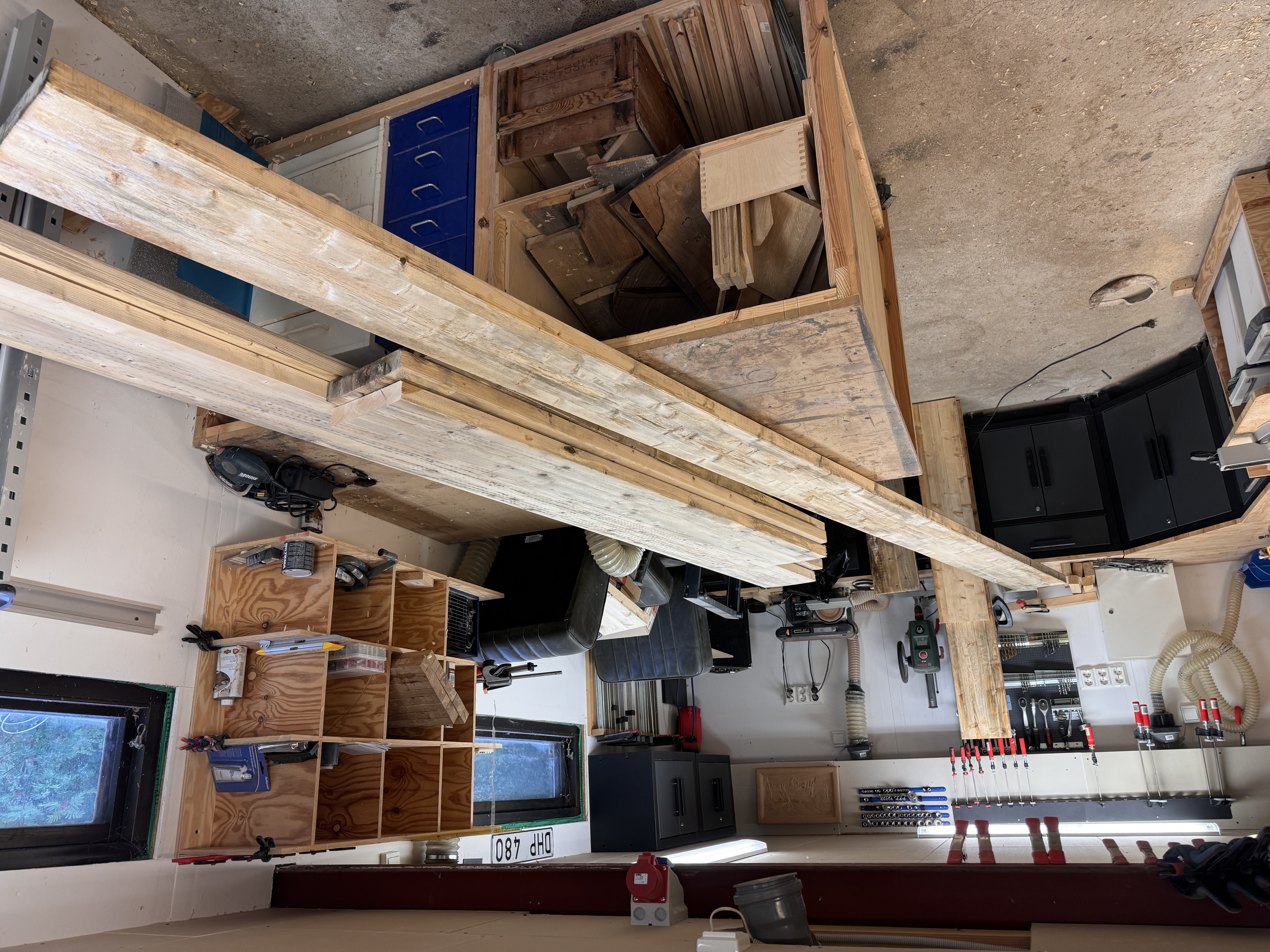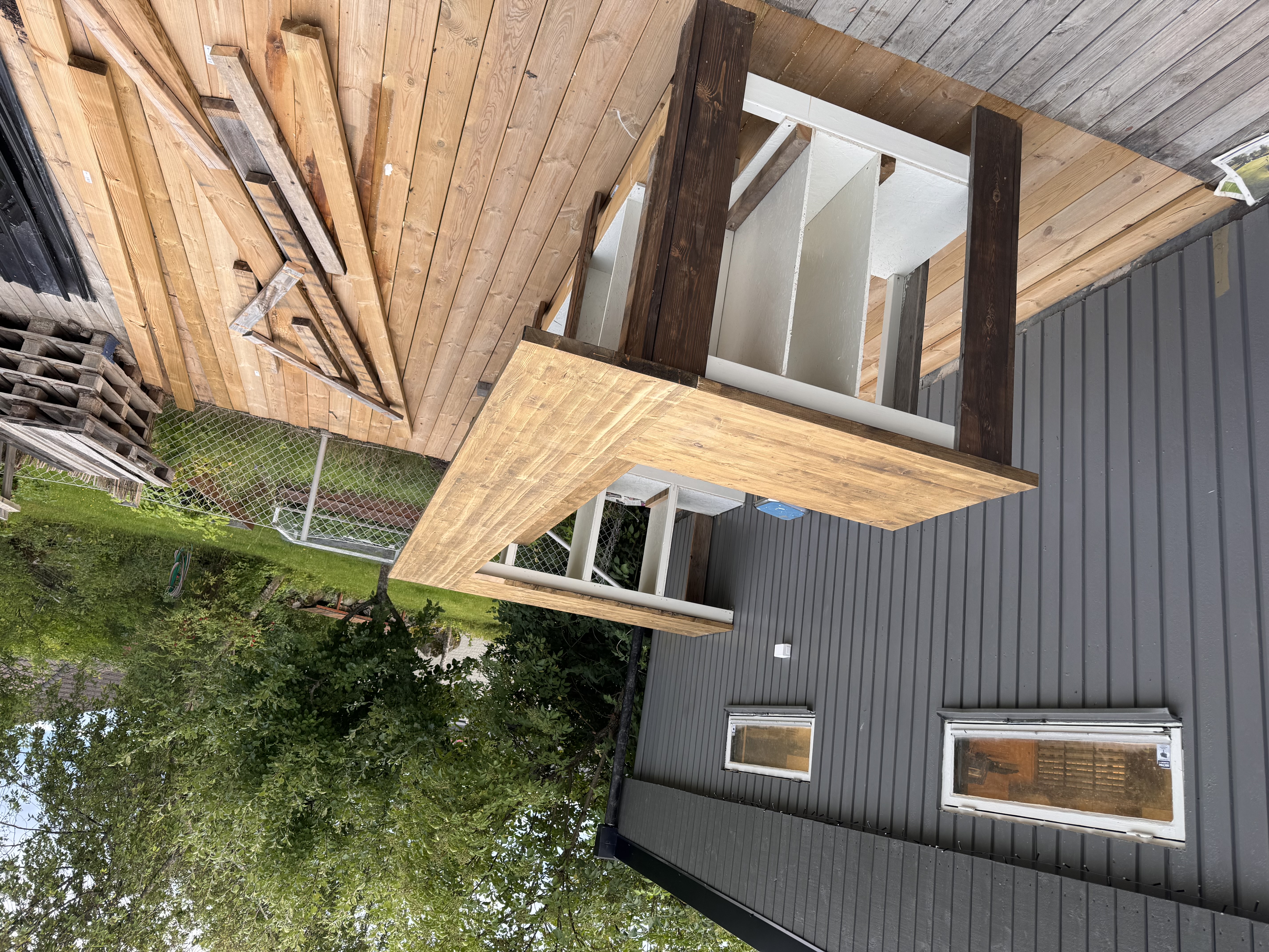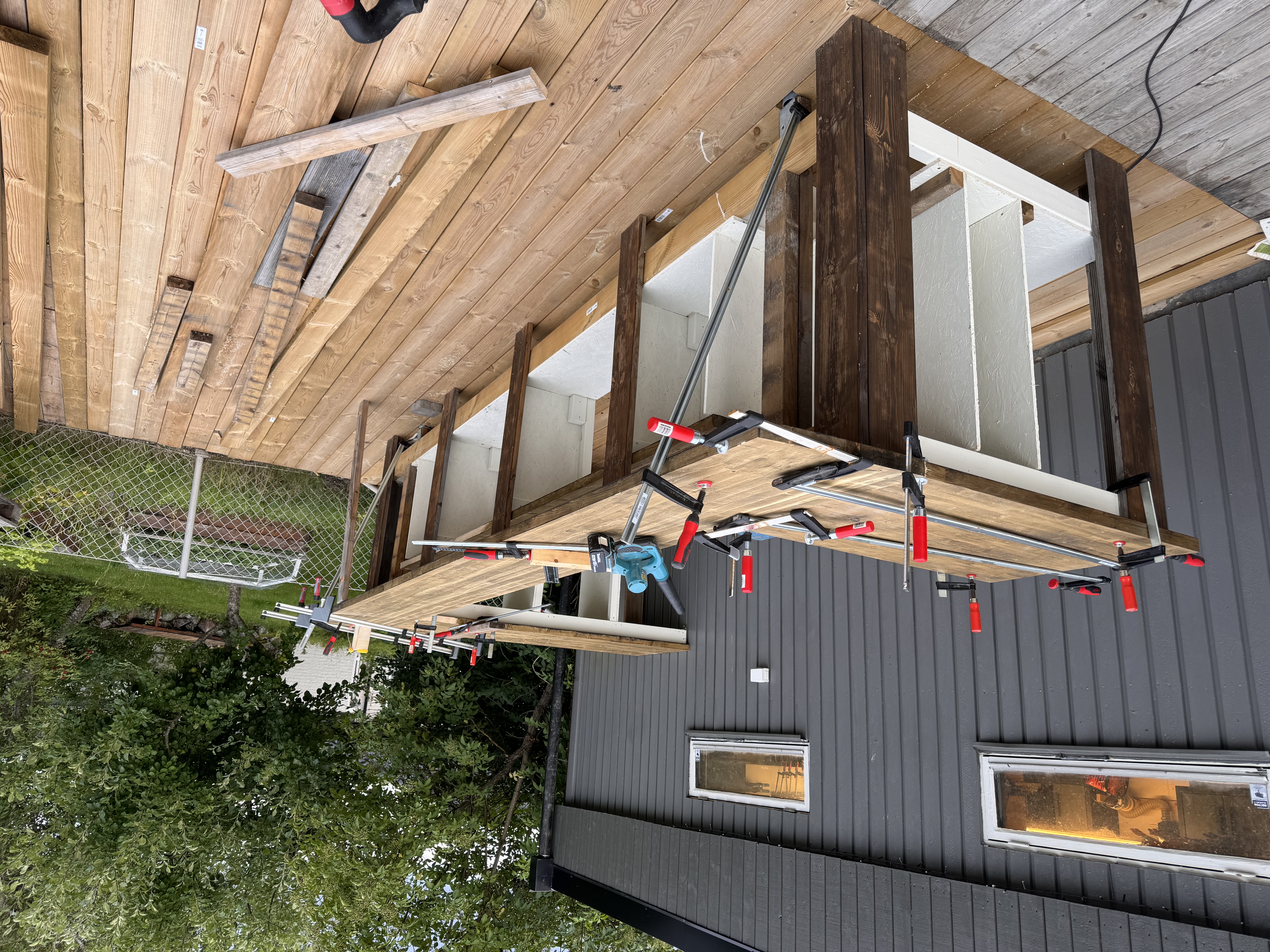 Bought laminated timber beams that were planed and glued together into a countertop, and it was quite a hassle to get it to fit and stay straight. We'll see how it looks after the winter.