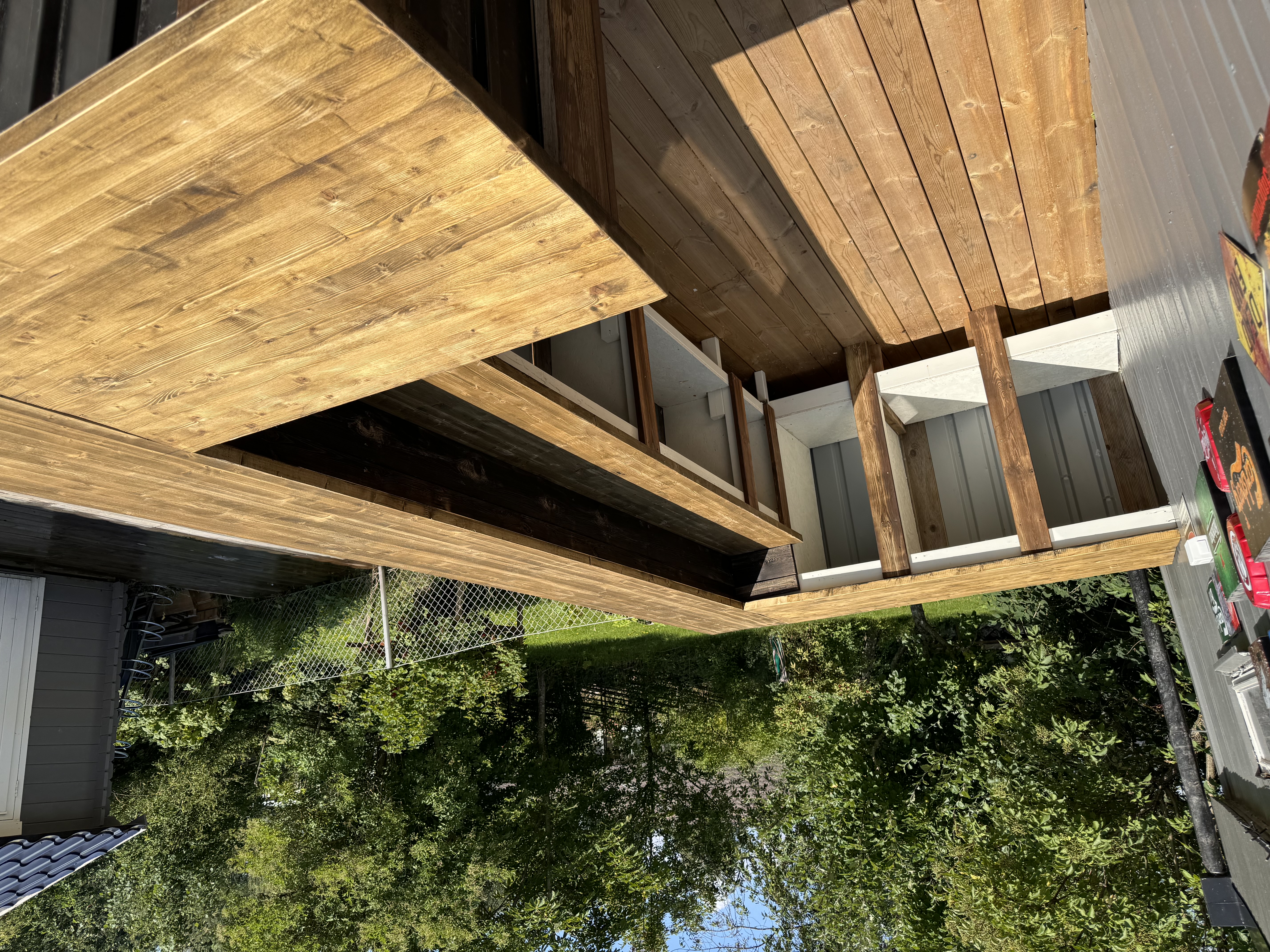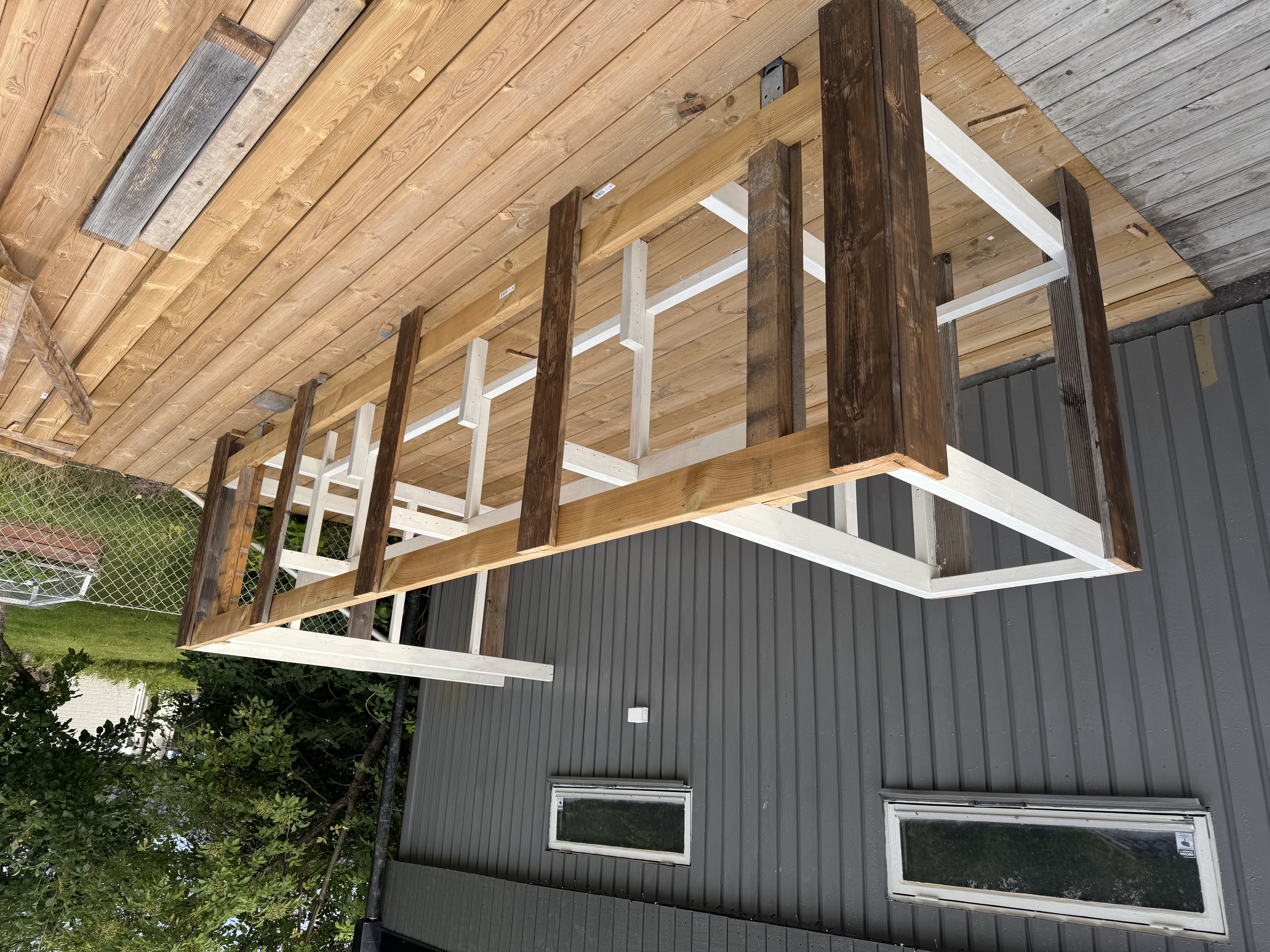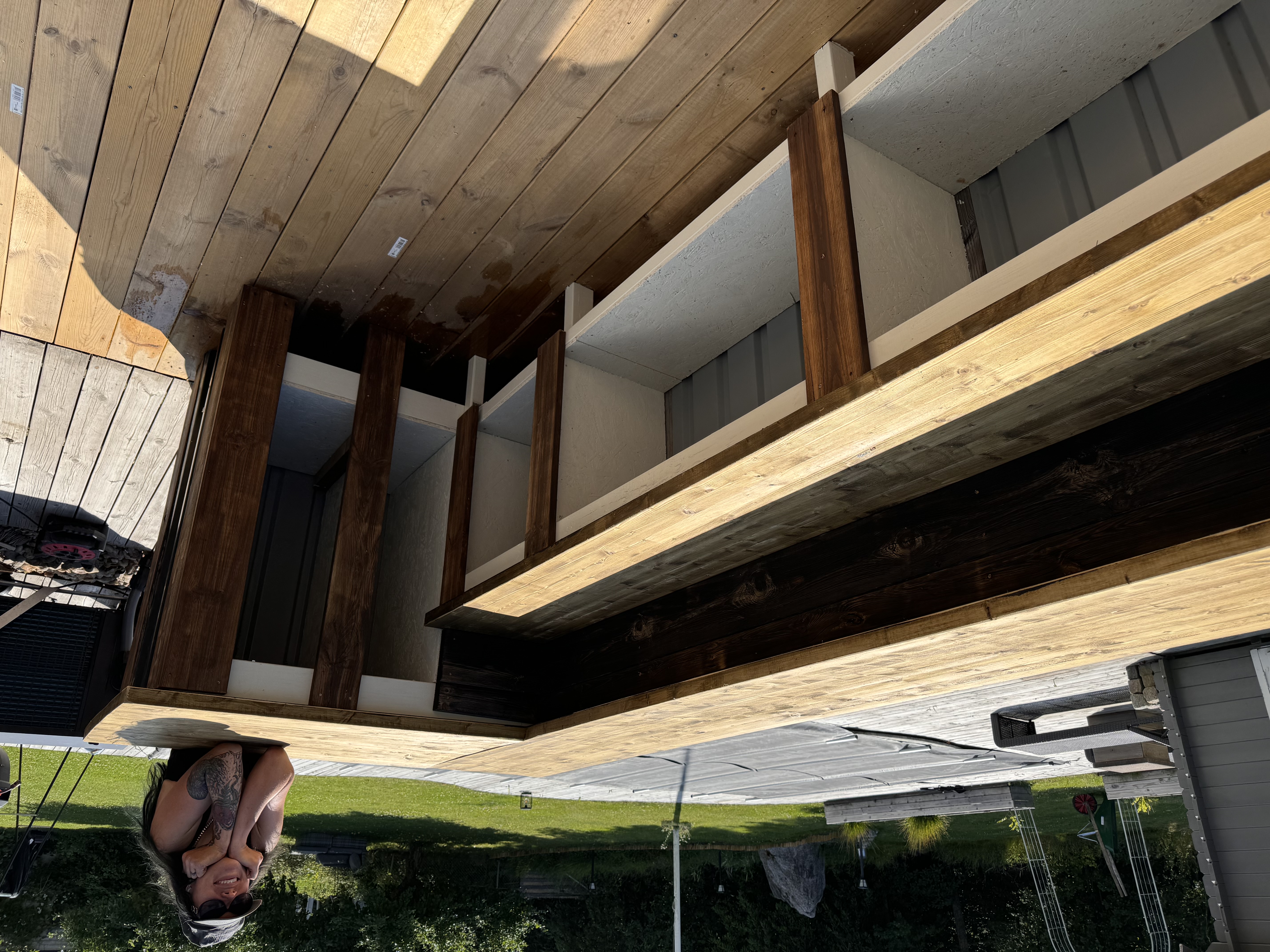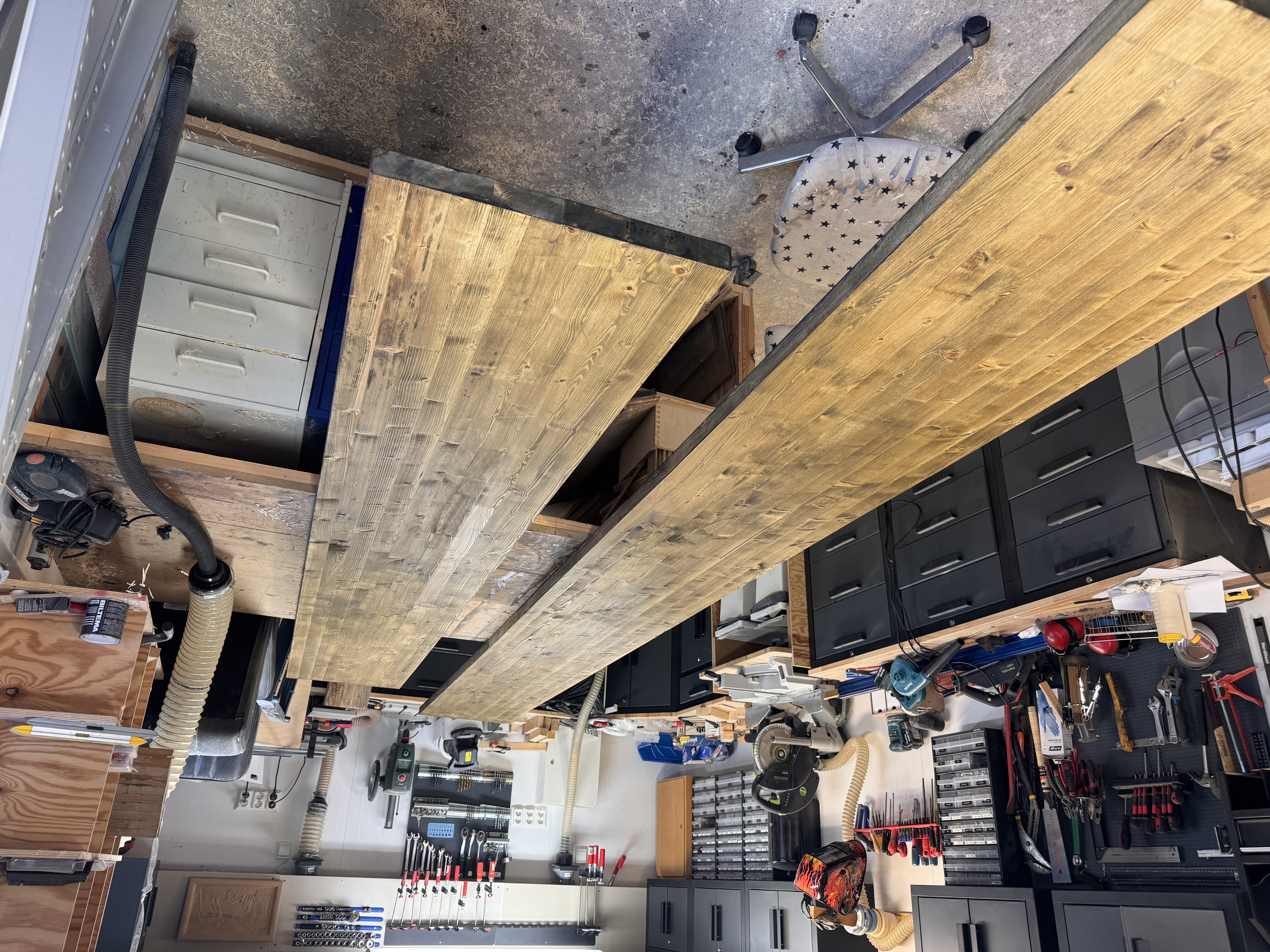 Bought laminated timber beams that were planed and glued together into a countertop, and it was quite a hassle to get it to fit and stay straight. We'll see how it looks after the winter.